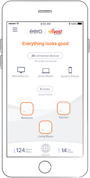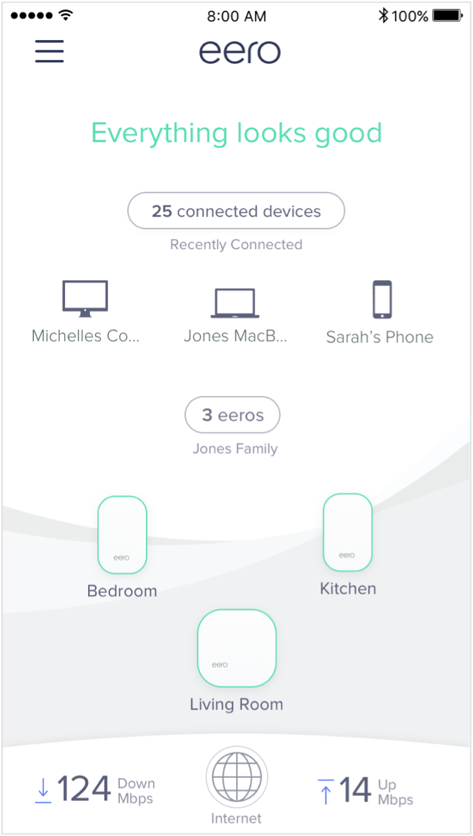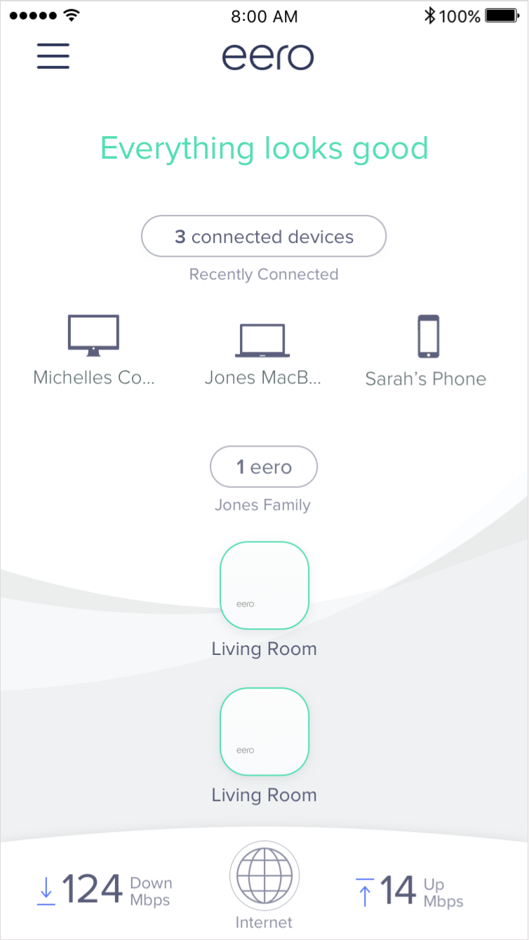Woo-hoo! Your network is up and running with no issues. All your eeros located at the bottom of your home screen should be outlined in green and streaming your favorite content from anywhere in your home is good-to-go.