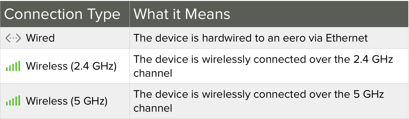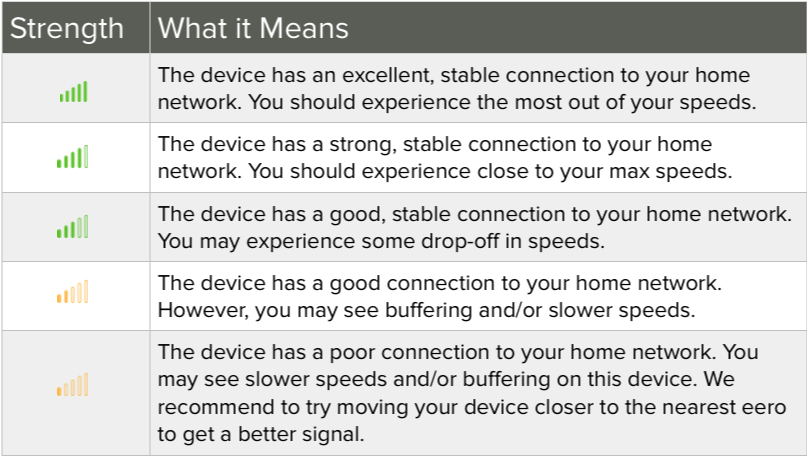 When on a wireless network, either the 2.4 or 5 GHz frequency, the strength of your device to the eero network is represented in five status bars.