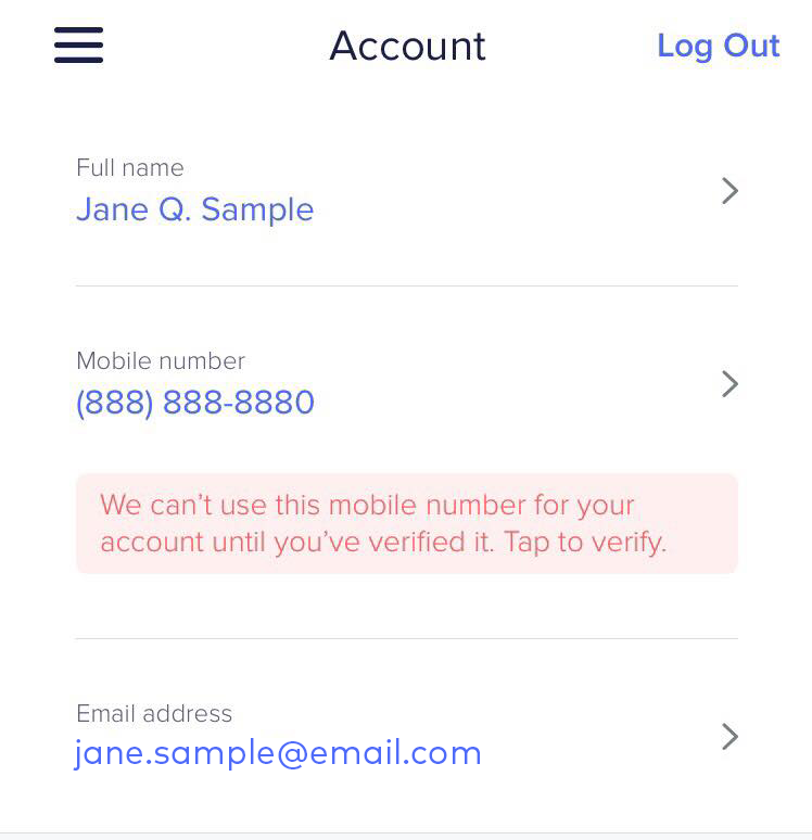 You can update your mobile number and email address within the app. Tap the hamburger menu in the top left corner of the app and tap Account from the menu. Tap into the Mobile or Email field, type your changes, and tap Next. This will take you to a verification screen. You should receive a verification code either through phone or email — whichever you just updated. Enter the code in the verification screen to save your changes.