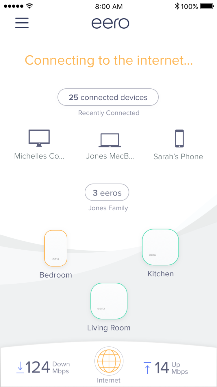 When the status of your network is yellow and reads Connecting to the Internet, your eeros are coming back online potentially from a reboot, ISP (Internet Service Provider) outage, or any other situation where your network was just previously offline. You will notice your eero’s LED blinking white, turning to a solid white once it is back online.