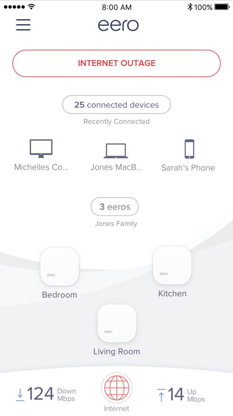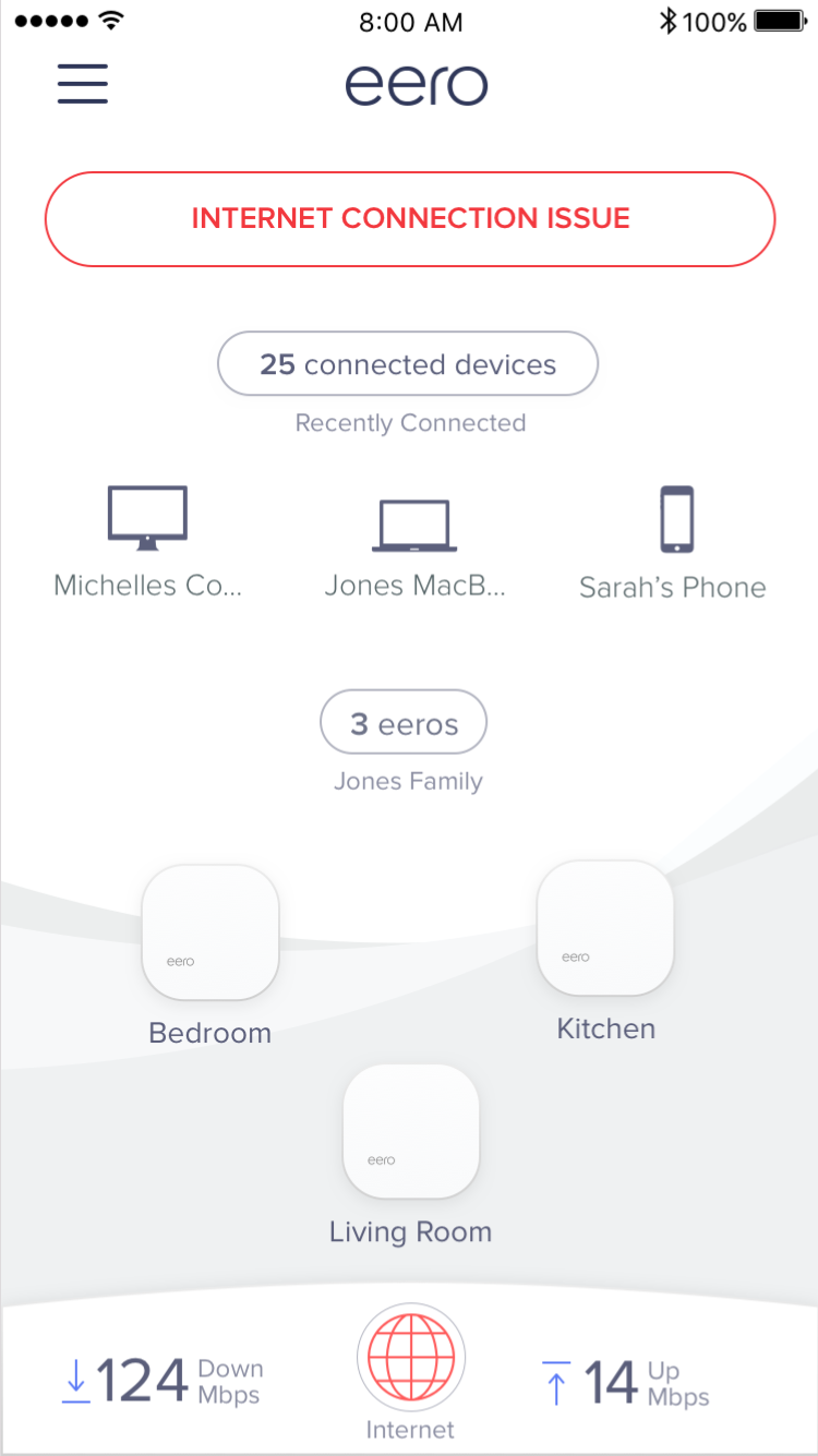 You can find the current status of your eero network at the top of the eero app home screen. Please see below for a breakdown of each status: