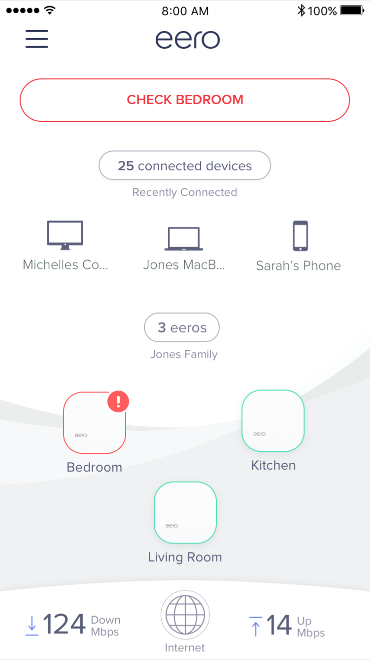 From this list, all the eeros online are visible under the Online and healthy section. Your gateway eero, the one connected to your modem, will have an identifier and be at the top of the list. If any of your eeros are having an issue, a section titled Check eeros will appear at the top.